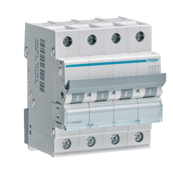 Чотириполюсний автомат Hager використовується для захисту трифазних мереж із нульовим провідником. Підходить для встановлення в електрощитах різного типу.