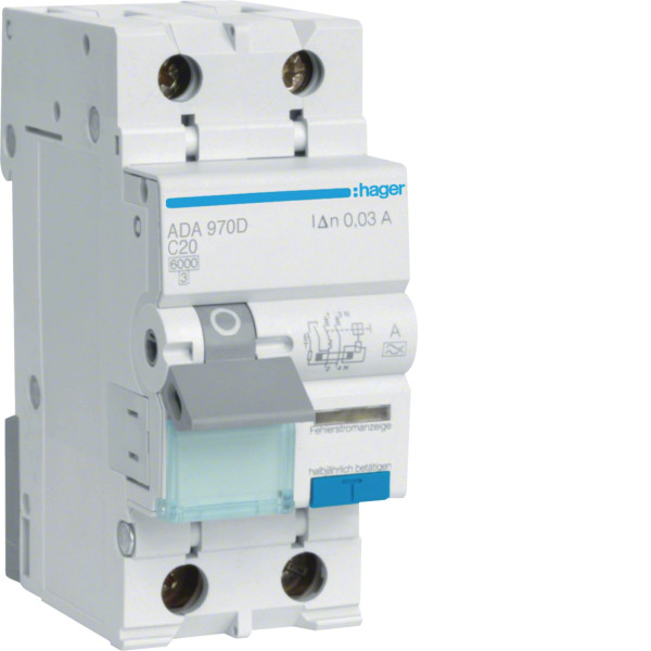 Hager ADA970D типу A забезпечує захист людей від ураження електричним струмом і запобігає виникненню пожежі внаслідок пошкодження ізоляції або витоку струму на землю. Пристрій постійно контролює баланс струмів у фазному та нульовому провідниках. У разі появи диференційного струму понад 30 мА відбувається автоматичне відключення лінії.