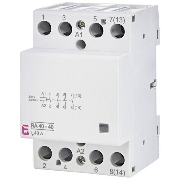 - Контактор модульний ETI RA 40-40 призначений для дистанційного керування чотирма силовими лініями навантаження до 40 А. Його використовують для автоматичного вмикання та вимикання освітлення, насосів, вентиляції та іншого електрообладнання через таймери, реле або системи керування.