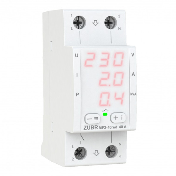 ZUBR MF2-40 red - мультифункціональне реле контролю напруги та струму для однофазних електромереж 230 В. Пристрій призначений для комплексного захисту побутового та промислового обладнання від перенапруги, заниженої напруги, перевищення струму та перевантаження по потужності. Підходить для монтажу на DIN-рейку у щитку.