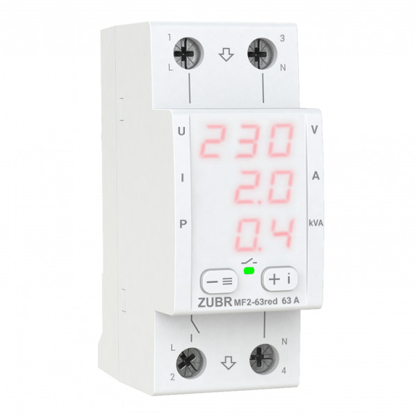 ZUBR MF2-50 red - мультифункціональне реле контролю напруги та струму для однофазних електромереж 230 В. Пристрій призначений для комплексного захисту побутового та промислового обладнання від перенапруги, заниженої напруги, перевищення струму та перевантаження по потужності. Підходить для монтажу на DIN-рейку у щитку.