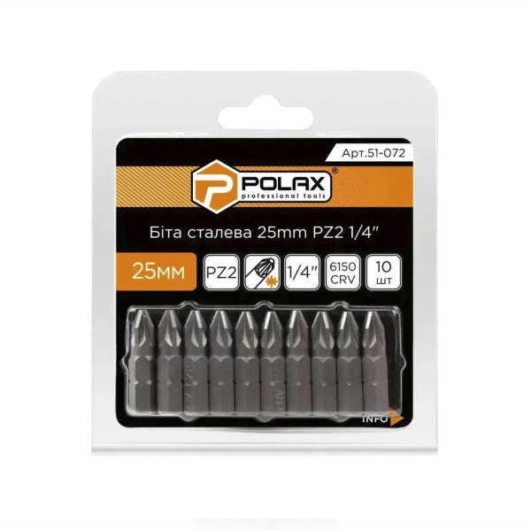 Біта сталева Polax 25 мм - практична та довговічна конструкція для виконання широкого спектру монтажних та ремонтних робіт. Вироби виготовлені із міцної хром-ванадієвої сталі (CrV), що забезпечує високу зносостійкість та стабільну роботу навіть при інтенсивному навантаженні.
