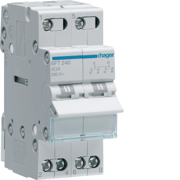 Перемикач Hager SFT240 - модульний двополюсний перемикач навантаження типу I-0-II, призначений для ручного перемикання електричних ліній або джерел живлення в однофазних мережах змінного струму. Пристрій використовується в розподільчих електрощитах для безпечного та зрозумілого керування подачею електроенергії між двома незалежними джерелами або електричними лініями.