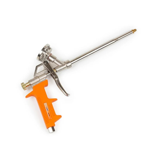 Модель призначена для роботи з балонами монтажної піни, оснащеними стандартною різьбовою насадкою. Завдяки подовженому металевому стовбуру зі звуженням на кінці, пістолет легко справляється з нанесенням піни у важкодоступних місцях — між рамами, у глибоких нішах, кутових з’єднаннях та інших складних ділянках. Така конструкція також підвищує тиск піни на виході, забезпечуючи рівномірне та щільне заповнення без перевитрат матеріалу.