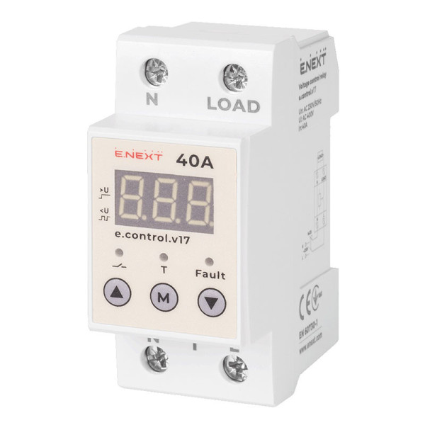 Реле контролю напруги однофазне 40А з індикацією e.control.v17 — це пристрій автоматичного захисту, призначений для безперервного моніторингу параметрів живлення в однофазних мережах змінного струму. При відхиленні напруги від встановлених користувачем меж реле відключає навантаження із заданою витримкою часу та автоматично відновлює подачу живлення після стабілізації показників.