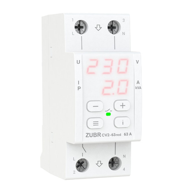 Реле контролює напругу, струм і потужність у режимі реального часу. Якщо параметри виходять за встановлені межі, ZUBR CV2-63 red вимикає підключене навантаження. При перевищенні струму або потужності відключення відбувається через заданий час затримки, що дозволяє уникнути хибних спрацьовувань при короткочасних пускових струмах.